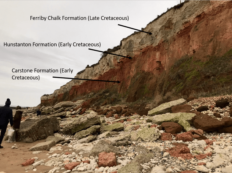 Hunstanton is famous for its unique red and white chalk cliffs. These cliffs are cretaceous in age and you can find different things in the different layers.